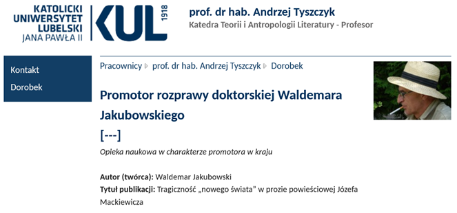 Powtarzam temat pracy doktorskiej: „Tragiczność ‚nowego świata’ w prozie powieściowej Józefa Mackiewicza”. Warto w tym miejscu słabiej zorientowanych w wykazie i dorobku polskich pisarzy XX wieku czytelników poinformować, kim był ów „bohater” tej rozprawy: