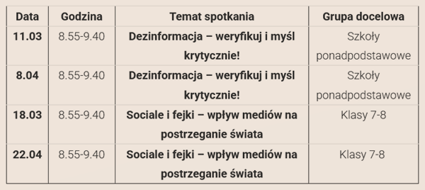 Zajęcia z zagrożenia dezinformacją dla szkół ponadpodstawowych, przygotowane przez NASK, pokazują, jak manipulacja i błędy poznawcze wpływają na pierwsze poważne decyzje, w tym wybór szkoły, pracy i kształtowanie opinii. Uczą analizy obrazu, weryfikacji źródła, sprawdzania kontekstu i krytycznego myślenia na podstawie metody S.P.R.A.W.D.Z.A.M.