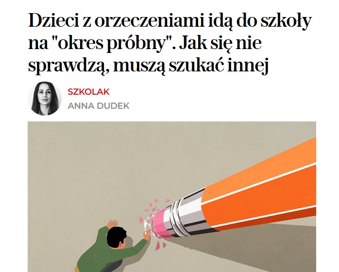 Dziennikarka „Wysokich Obcasów” podjęła niełatwy temat. Chodzi o dzieci z potwierdzonymi trudnościami w funkcjonowaniu, które – tak się rodzicom wydawało – mogłyby trafić do szkół prywatnych oferujących przyjazne warunki, sprzyjające indywidualizacji. To są często dzieci już pokiereszowane, np. po wielu zmianach przedszkoli. Okazuje się, że prywatne szkoły robią uniki, zasłaniając się brakiem warunków. Dzieje się to wszystko w sferze niedomówień. Wysoka subwencja nie jest argumentem za, gdy szkoła kalkuluje, że może stracić innych uczniów, jeśli przyjmie dzieci z problematycznymi zachowaniami. Natomiast wypowiadający się w artykule prawnik przekonuje, że prywatne szkoły absolutnie nie mają prawa odrzucać podań dzieci z orzeczeniami, bo to godzi w konstytucyjne zapisy. Rzeczywistość jest jednak o wiele bardziej skomplikowana.
