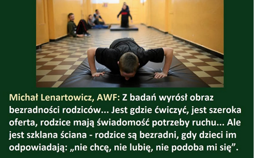 Na fanpage grupy „Nie dla chaosu w szkole” zamieszczono dzisiaj tekst, dzięki któremu dotarłem do bardzo wartościowego artykułu Radosława Leniarskiego i Dariusza Wołowskiego, zatytułowanego „Polska bezradnych rodziców. Jak zmusić dziecko do ruchu nie robiąc mu krzywdy”, opublikowanego dzisiaj na portalu „SPORT.PL”: