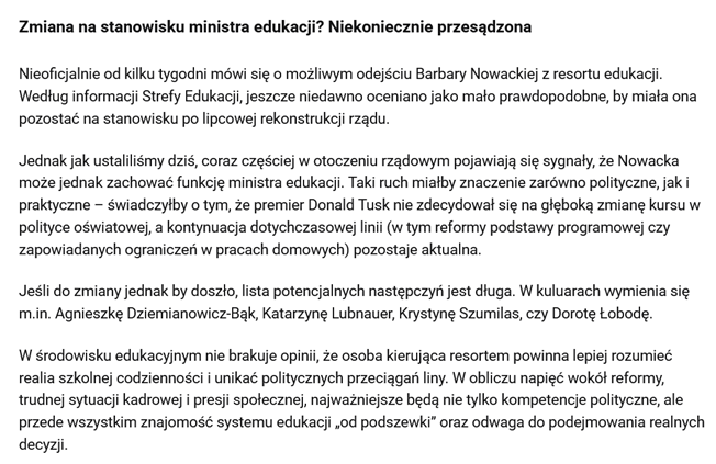 Bo wszak założycielką i przewodniczącą tej ostatniej była nasza ministra – Barbara Nowacka. I to dawało jej w dotychczasowej koalicji pozycję „nie do ruszenia”. Więc może teraz, gdy już będzie tylko jedną z wielu (nawet będąc w zarządzie nowo utworzonej partii), to premier, mając tyle sygnałów o jej nienajlepszych decyzjach i ich skutkach, da się przekonać do zmian personalnych w tym resorcie, i powoła kogoś, kto potrafi wsłuchiwać się (nie tylko podczas pokazowych spotkań) w głosy praktyków i PRAWDZIWYCH ekspertów.