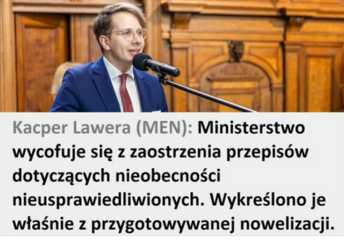 Na początek podzielę się moimi refleksjami, które wywołał ten tekst. Otóż nie mam wątpliwości, że ów pomysł, aby zmienić tak prawo, by zmniejszyć limit dozwolonych nieusprawiedliwionych nieobecności ucznia na zajęciach szkolnych, z  dotychczasowych 50% do 25%, to kolejny przykład myślenia naszej władzy oświatowej „pod publiczkę”, bez wcześniejszego rozpoznania jak to jest z tym problemem naprawdę, w codziennej szkolnej rzeczywistości. I nie mam wątpliwości co do tego, że pozostawiając prawo rodziców do niczym nie ograniczonego usprawiedliwiania nieobecności – bez szans na obiektywne zweryfikowania powodów tejże, zwłaszcza w przypadku uczniów starszych klas podstawówki i szkół ponadpodstawowych, takie ograniczenie dopuszczalnego limitu nieobecności do 25% ogólnego czasu nauki w semestrze – było jedynie pozorowaniem rzekomej dbałości ministerstwa o poziom szkolnej edukacji.