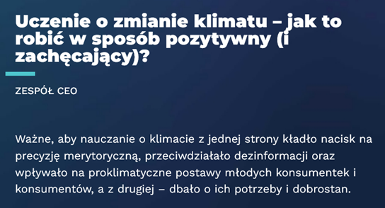 Nam w CEO zależy na tym, aby nauczanie o klimacie z jednej strony kładło nacisk na precyzję merytoryczną, przeciwdziałało dezinformacji oraz wpływało na proklimatyczne postawy młodych konsumentek i konsumentów, a z drugiej – dbało o potrzeby i dobrostan młodzieży, dla której zmiana klimatu jest jedyną znaną rzeczywistością.
