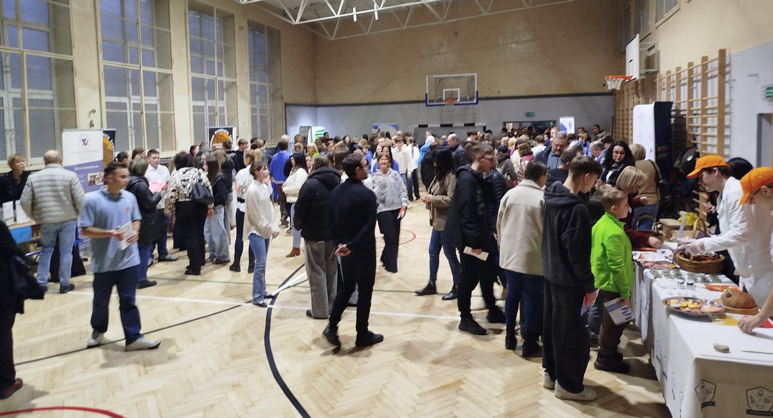 Oto widok głównego pomieszczenia tych targów– szkolnej sali gimnastycznej – kilka chwil po zakończeniu ceremonii ich otwarcia