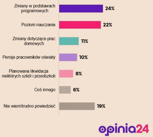 Analiza odpowiedzi pokazuje wyraźne różnice w postrzeganiu problemów w zależności od poziomu wykształcenia. Osoby z wykształceniem podstawowym rzadziej wskazują zmiany w podstawach programowych (16 proc.), a częściej deklarują brak zdania (29 proc.). Z kolei respondenci z wyższym wykształceniem częściej za największy problem uznają zarówno pensje pracowników oświaty (15 proc.), jak i zmiany w podstawach programowych (30 proc.).