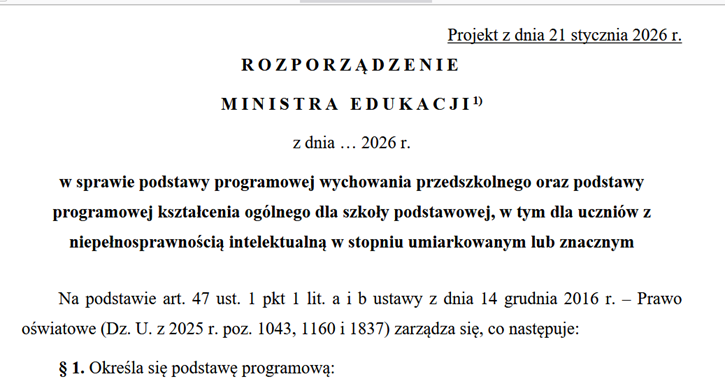 Postanowiłem, choć z kilkudniowym opóźnieniem, zamieścić fragmenty teksu z portalu „epedagogika.pl”informujące o opublikowaniu przez MEN projektu rozporządzenia, na mocy którego ministerstwo zamierza z dniem 1 września 2026 roku rozpocząć wdrażanie reformy podstaw programowych, zwanej „Kompas jutra” , a także tekst tego projektu: