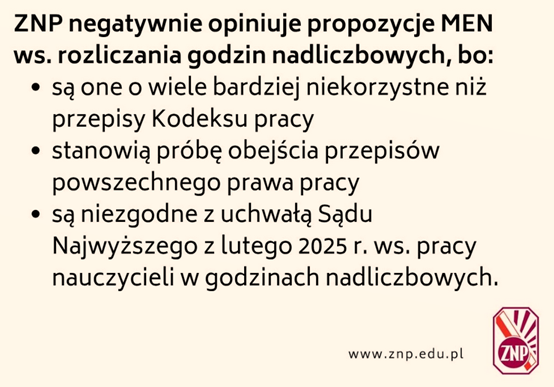 Dlatego w ocenie ZNP „projekt nowelizacji w omawianym zakresie dokonuje ewidentnego ograniczenia uprawnień pracowniczych nauczycieli związanych z pracą w godzinach nadliczbowych – w sposób nie dochowujący nawet ogólnych standardów prawa pracy”.