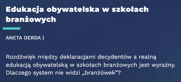 „Muszę przyznać samokrytycznie, że moje prognozy w dziedzinie polityki nie grzeszą trafnością. Półtora roku temu byłem przekonany, że nowa władza odmieni oblicze polskiej edukacji, a teraz pozostało mi już tylko poczucie zawodu. Po kilku udanych ruchach na początku (podwyżka płac nauczycieli, wymiana kuratorów), obecnie mam wrażenie deja vu, tylko z odmiennym zwrotem ideologicznym. Owszem, jest więcej uśmiechu i padają piękne deklaracje, ale brakuje konkretnych działań, wychodzących naprzeciw największym bolączkom systemu. W zamian oferuje się nam reformę programową, po której – jeśli wierzyć ministrze Nowackiej – wszyscy: uczniowie, rodzice, nauczyciele, pokochają szkołę i będą szczęśliwi. […]